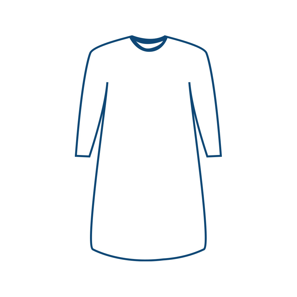 Jednorazowy fartuch medyczny izolacyjny, pełnobarierowy, wykonany z włókniny polipropylenowej powlekanej polietylenem identycznej ze stosowaną do produkcji kombinezonów ochronnych.