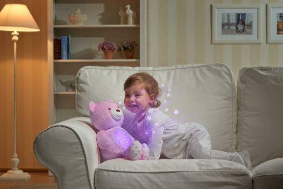 Chicco Miś z Projektorem Przytulanka z ukrytym w brzuszku projektorem światła i muzyki! Miękki, delikatny i miły w dotyku pluszak z ukrytym w brzuszku mechanizmem, dzięki któremu czas, który dziecko spędza z maskotką upływa przy przyjemnej muzyki i efektach świetlnych. Efekty uruchamia naciśnięcie przycisku z serduszkiem, umieszczonego na brzuszku misia. Przez brzuszek misia emitowane są efekty świetlne: intensywna rozgwieżdżona poświata delikatny blask wewnętrzne światełko idealne jako nocna lampka Dźwięki, których maluch słucha nieprzerwanie przez 30 minut to: muzyka klasyczna (Bach i Beethoven) muzyka nowoczesna soft rock jazz dźwięki natury wymiary : 65,4 x 52,7 x 22,2 cm Dostępne wersje kolorystyczne Misia Chicco: Różowa Niebieska Beżowa