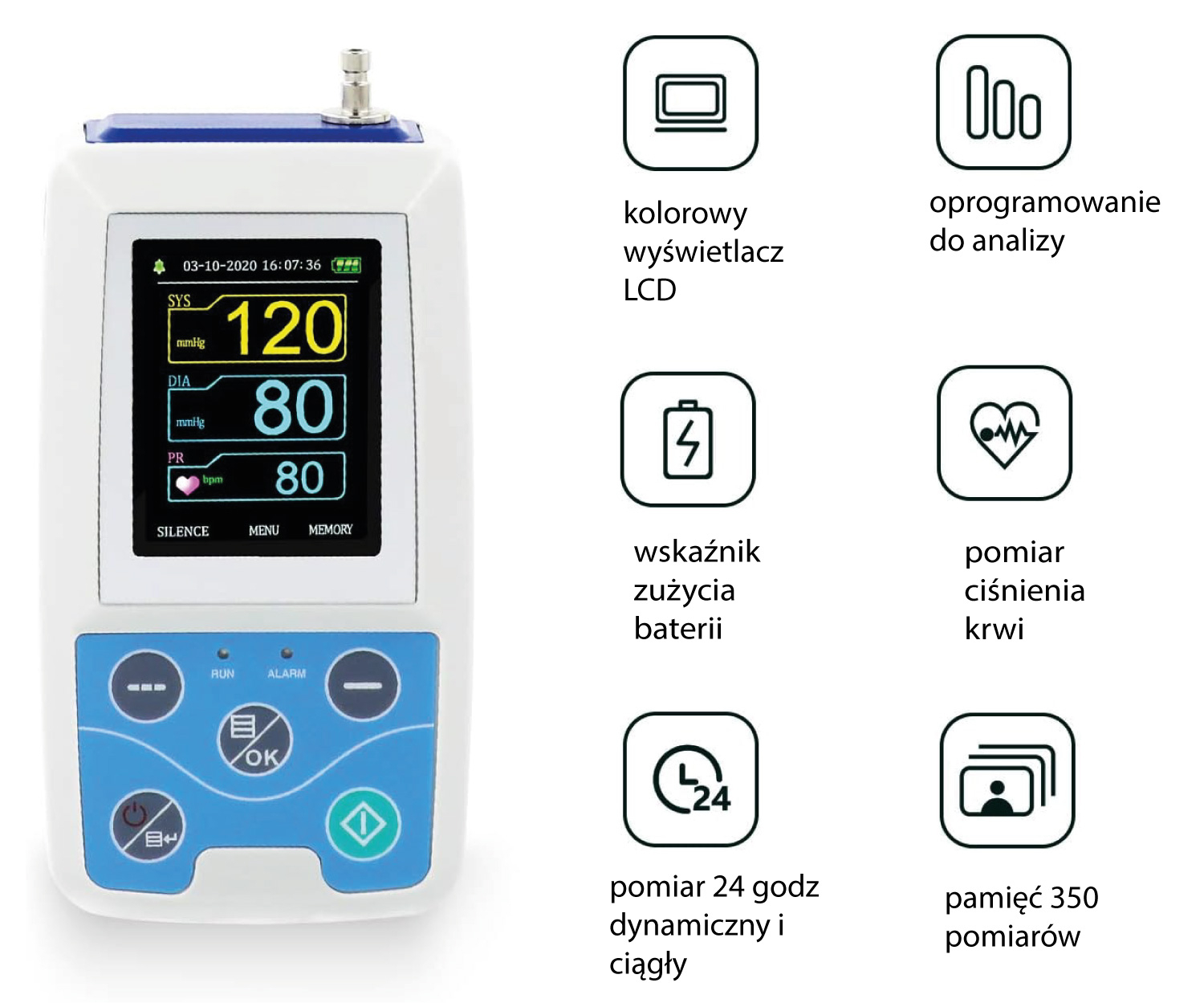 Urządzenie ma także pamięć na ponad 350 pomiarów w trybie holtera