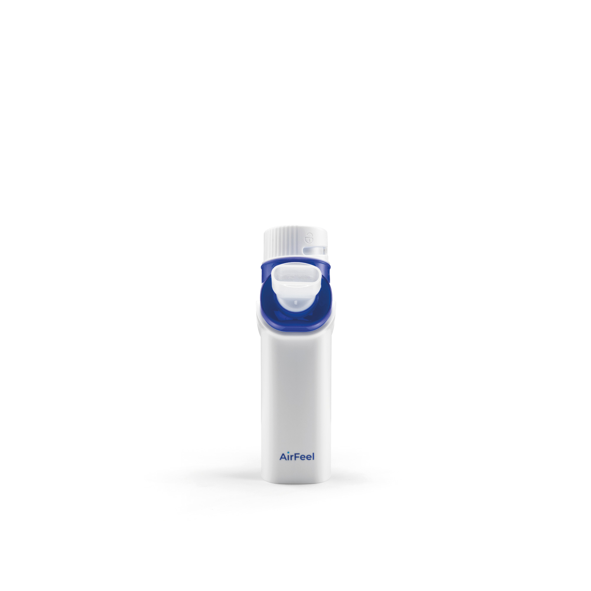 AirFeel trenażer oddechu z dwoma trybami: PEP i O-PEP Flaem AirFeel to zaawansowany trenażer oddechu oraz urządzenie rehabilitacyjne zaprojektowane do poprawy funkcji układu oddechowego. Wykorzystując innowacyjny mechanizm z wykorzystaniem stalowej kulki, urządzenie skutecznie oczyszcza płuca poprzez stymulację drzewa oskrzelowego. Posiadając dwa tryby pracy – O-PEP i PEP – Flaem AirFeel umożliwia elastyczną terapię: O-PEP dostarcza dynamicznych oscylacji ciśnienia dla ułatwienia oddychania, natomiast PEP (Positive Expiratory Pressure) wspomaga otwarcie dróg oddechowych i zwiększenie objętości płuc. Efektywna terapia wydechowa z użyciem urządzenia PEP Po obróceniu nasadki do pozycji „zamkniętej” blokuje ona wewnętrzną kulkę i tłoczy powietrze tylko przez wybrany otwór wskazany przez fizjoterapeutę. Jako urządzenie z dodatnim ciśnieniem wydechowym (PEP), AirFeel zapewnia przeciwciśnienie w drogach oddechowych podczas wydechu. Może to poprawić oczyszczanie poprzez gromadzenie gazu za śluzem poprzez wentylację poboczną i tymczasowe zwiększenie funkcjonalnej pojemności resztkowej. O-PEP: Złagodzenie Zatorów i Poprawa Drożności Drogowych Płucnych Po obróceniu nasadki do pozycji „otwartej” nakrętkę pierścieniową należy obrócić, aby ustawić obciążenie oporowe w pozycji Ø, wykonując terapię O-PEP. OPEP to połączenie terapii PEP i oscylacji: PEP działa poprzez obwodowe przesunięcie punktu równego ciśnienia, aby zmaksymalizować przepływ powietrza i zapobiec dynamicznemu zapadaniu się dróg oddechowych. Wydłuża to czas wydechu i wentylację pęcherzyków płucnych, ułatwiając wymianę gazów. Oscylacje zmniejszają lepkosprężyste właściwości śluzu, mobilizując śluz w drogach oddechowych, umożliwiając krótkie serie zwiększonego przepływu powietrza wydechowego, co pomaga mobilizować wydzieliny w drogach oddechowych. Możliwość dokupienia inhalatora Flaem i nebulizatora RF7. Dodatkowo, dzięki opcji wibronebulizacji po podłączeniu do kompresora, urządzenie można efektywnie wykorzystać do inhalacji leków. Łatwość czyszczenia Produkt można całkowicie zdemontować, tym samym ułatwiając dokładne czyszczenie jego komponentów, które można czyścić w autoklawie. Przenośny i ergonomiczny Wyposażony w łatwy do trzymania uchwyt, który może zostać zdjęty i użyty do przechowywania różnych elementów produktu, znacząco ułatwiając transport. Łatwa regulacja Za pomocą nakrętki pierścieniowej można wybrać 5 różnych otworów PEP i odpowiednio zmodyfikować obciążenie oddechowe. W zestawie:AirFlaem, moduł PEP, ustnik, rękojeść, klips do nosa, etui. Możliwość dokupienia manometru. Dzięki dodatkowemu manometrowi terapeuta może zalecić najlepsze ustawienia leczenia, podczas gdy pacjent może sprawdzić prawidłowy postęp swojej terapii.