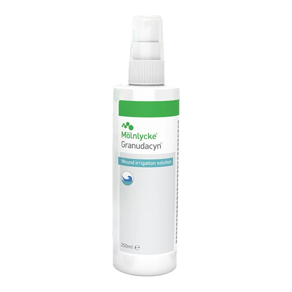Granudacyn® to roztwór do irygacji do oczyszczania i nawilżania ostrych, przewlekłych i zanieczyszczonych ran, a także oparzeń pierwszego i drugiego stopnia. Kwas podchlorawy (HOCl) zapewnia bezpieczną konserwację i sprawia, że Granudacyn jest niezawodnym rozwiązaniem do irygacji ran.
