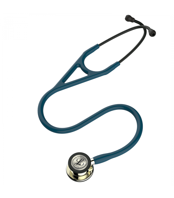 Prezentowany model to 3M™ Littmann® Cardiology IV™ z głowicą z szampańskim wykończeniem. Przewód w kolorze błęki karaibski. Model: 6190