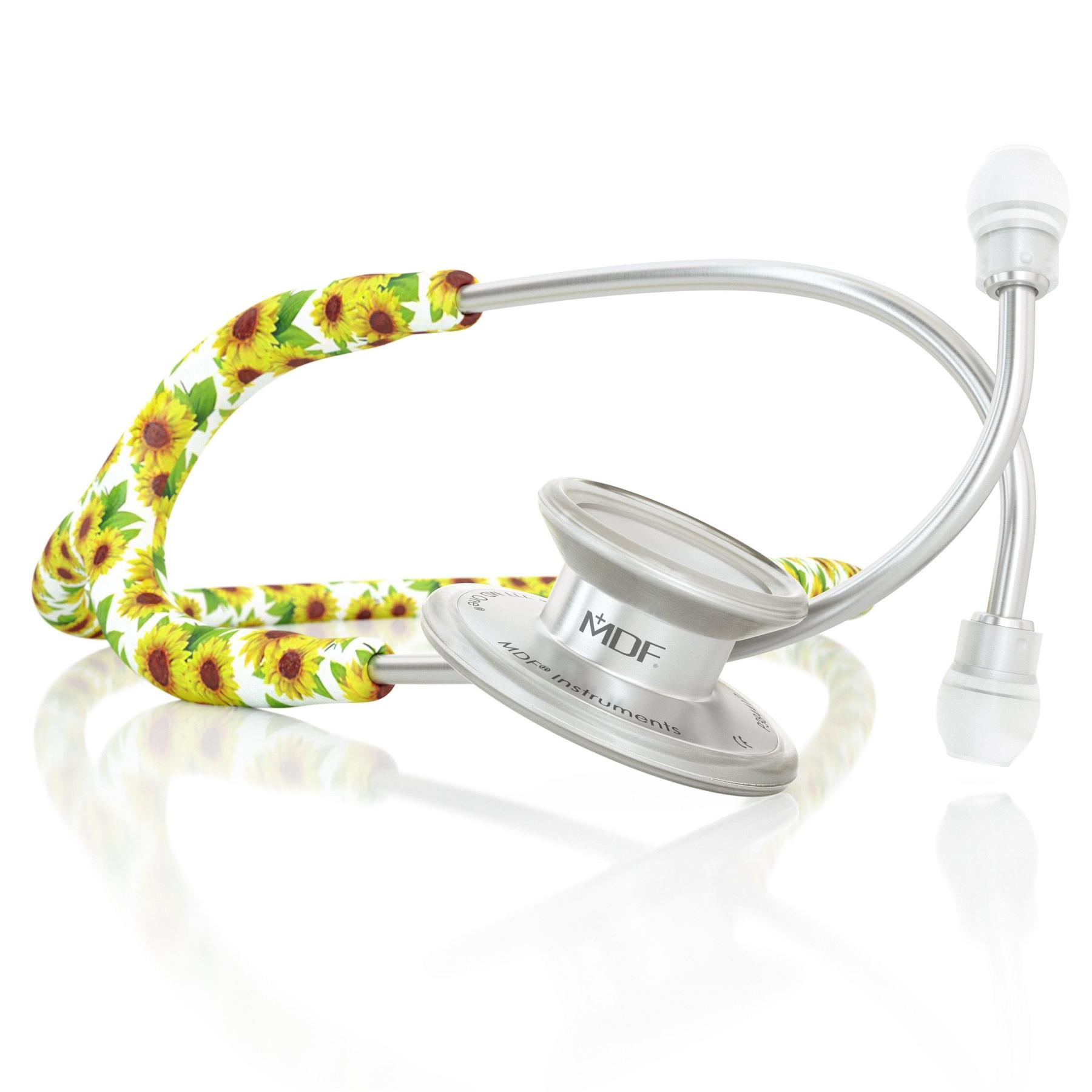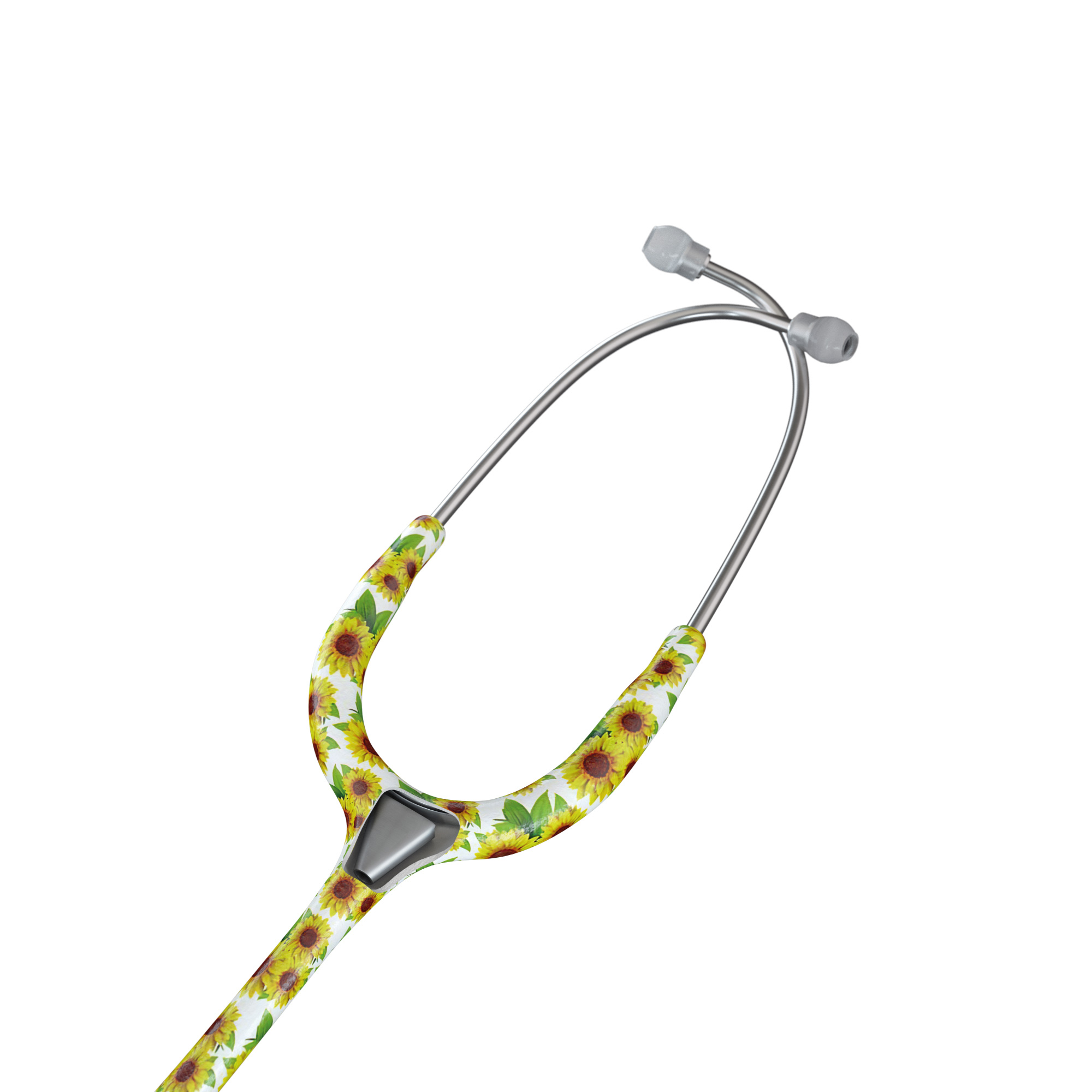 - oferta dotyczy stetoskopu z lirą w kolorze srebra i przewodem w słoneczniki.