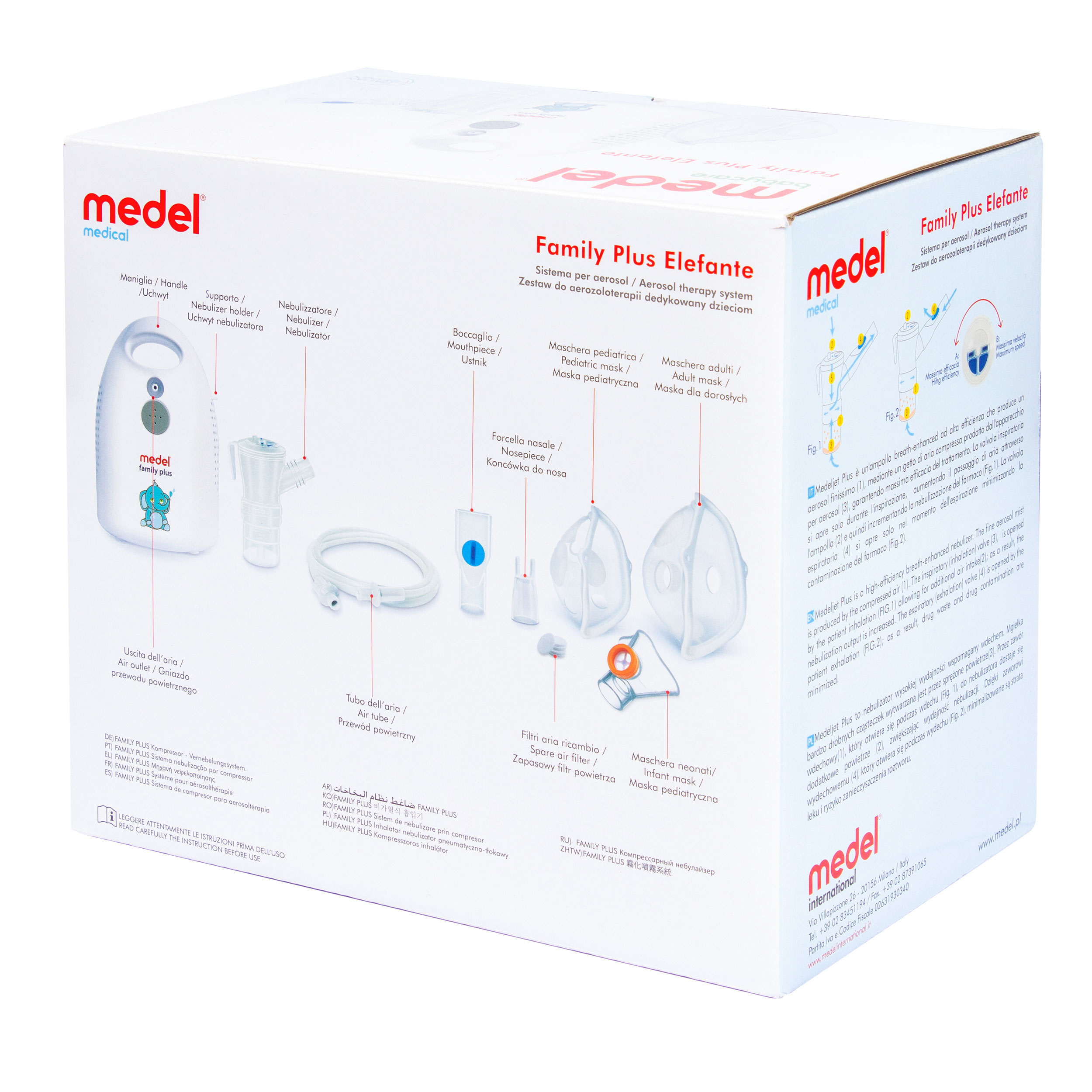 W zestawie z inhalatorem Medel Family Plus są, nebulizator Medel Jet Plus, ustnik, końcówka do nosa, przewód powietrzny, zamienne filtry powietrza, maska Medel Soft Touch dla dorosłych, Maska Medel Soft Touch dla dzieci 6m+, karta gwarancyjna, instrukcja w języku polskim oraz wygodna i poręczna torba Medel do bezpiecznego przechowywania i transportowania akcesoriów.