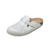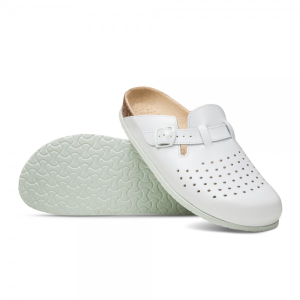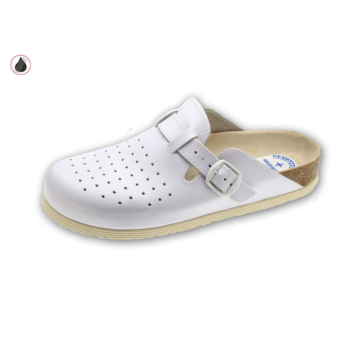 Cholewka z perforacją. Obuwie damskie i męskie na spodach przeciwpoślizgowych i wkładkach korkowo-gumowych z pełnym profilem ortopedycznym. Wyściółka i cholewka skórzana, możliwość regulacji tęgości. Buty medyczne na spodach antypoślizgowych. Są wykonane z naturalnej skóry wykończonej powłokami, które umożliwiają ich dezynfekcję oraz łatwe utrzymanie w czystości. Do ich czyszczenia można używać ogólnie dostępnych środków dezynfekcyjno – myjących. Buty z podeszwami odpornymi na oleje i tłuszcze zarówno roślinne, jak i zwierzęce. Obuwie jest zgodne z normą PN-EN ISO 20 347, która jest wymagana dla butów zawodowych do użytku w pracy. Spełniają one przepisy rozporządzenia Ministra Gospodarki z 21 grudnia 2005r. oraz dyrektywy 89/686/EWG. Umieszczony na obuwiu medycznym znak bezpieczeństwa CE kategorii I daje gwarancję najwyższej jakości, oraz, że wyrób jest bezpieczny dla użytkownika i nie zagraża środowisku naturalnemu. Buty posiadają atesty wydane przez: Instytut Przemysłu Skórzanego w Łodzi, Centralny Instytut Ochrony pracy w Warszawie. Cholewka wykonana z miękkiej skóry naturalnej odpornej na codzienne zmywanie i dezynfekcje. Elementy wewnętrzne z skóry bydlęcej, welurowej o doskonałej absorpcji wilgoci. Wkład korkowo gumowy z pełnym profilem ortopedycznym i kółkami ze specjalnej mieszanki odprowadzającej ładunki elektrostatyczne do podłoża. Podeszwa z gumy przewodzącej ładunki o właściwościach i bieżniku antypoślizgowym.
