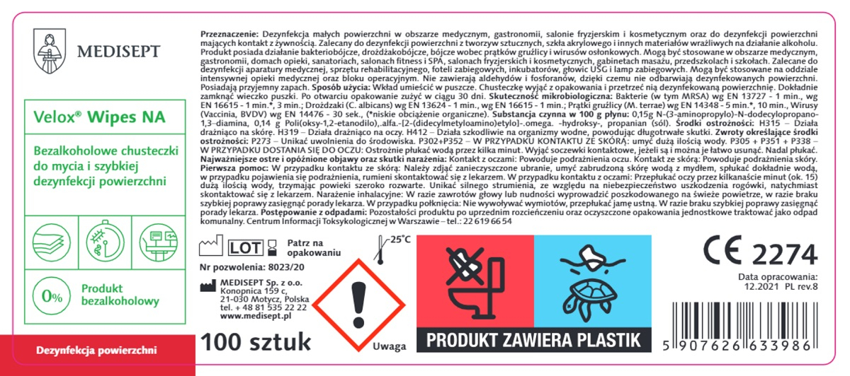 Velox Wipes NA są zalecane do dezynfekcji powierzchni nieinwazyjnych wyrobów medycznych z tworzyw sztucznych, szkła akrylowego, stali szlachetnej, metalu, aluminium, gumy, porcelany.