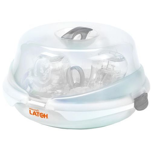 Chcesz absolutnej czystości butelek i akcesoriów dla niemowląt i bez czyszczenia ciężkimi chemikaliami, ale nie masz miejsca na klasyczny sterylizator do butelek dla niemowląt? Jak wszystko może być idealnie czyste? Ten sterylizator oferuje łatwy i naturalny sposób zabijania bakterii poprzez sterylizację butelek i pompek do karmienia piersią przez 2 do 6 minut w zależności od napięcia sieciowego. Pomieści 4 butelki lub 2 laktatory i inne akcesoria. Dla dodatkowej ochrony uchwyt pozostanie chłodny nawet w kuchence mikrofalowej.