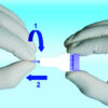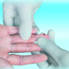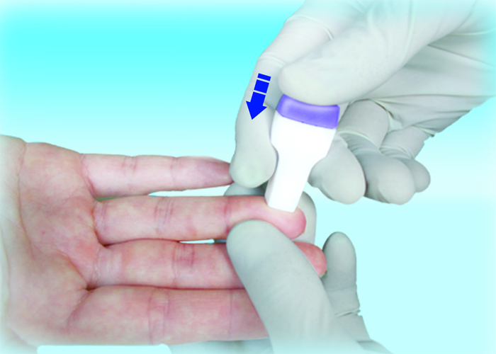 3) Lekko ucisnąć wokół nakłutego palca, aby uzyskać odpowiednią ilość potrzebnej krwi.