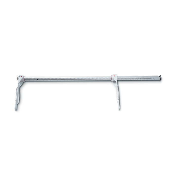 Wzrostomierz można na stałe przykręcić do przewijaka, zamontować na ścianie lub korzystać z niego w formie przenośnej. Duże ograniczniki głowy i stóp umożliwiają pomiar długości niemowlęcia. Składane suwaki. Wykoanany z aluminium.