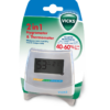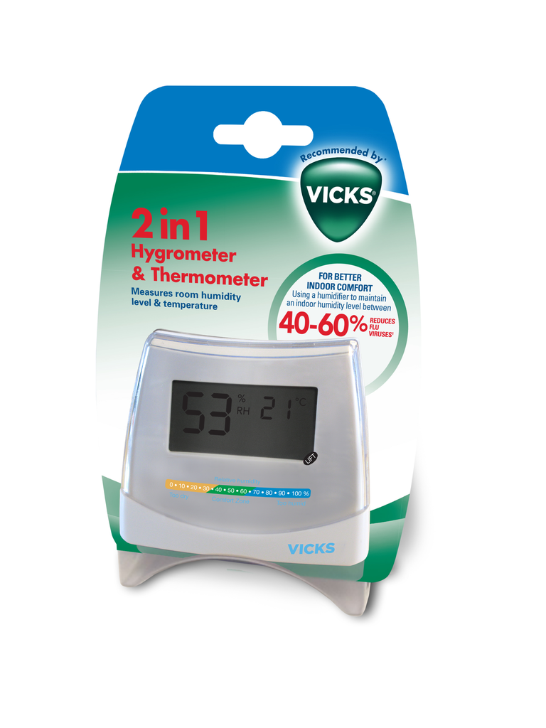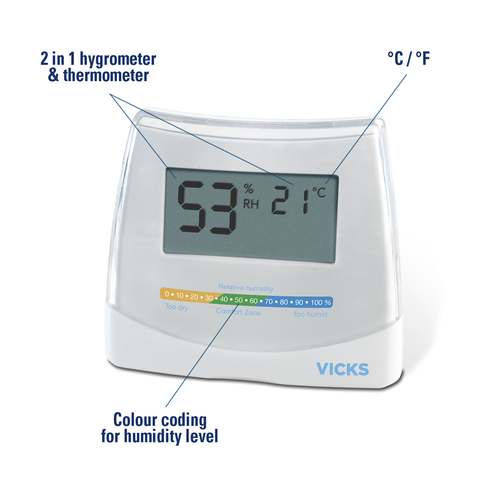 Higrometr i termometr Vicks® 2 w 1 umożliwiają monitorowanie poziomu wilgotności w pomieszczeniu oraz wyświetlanie temperatury w pomieszczeniu.