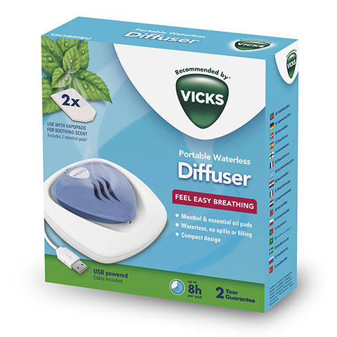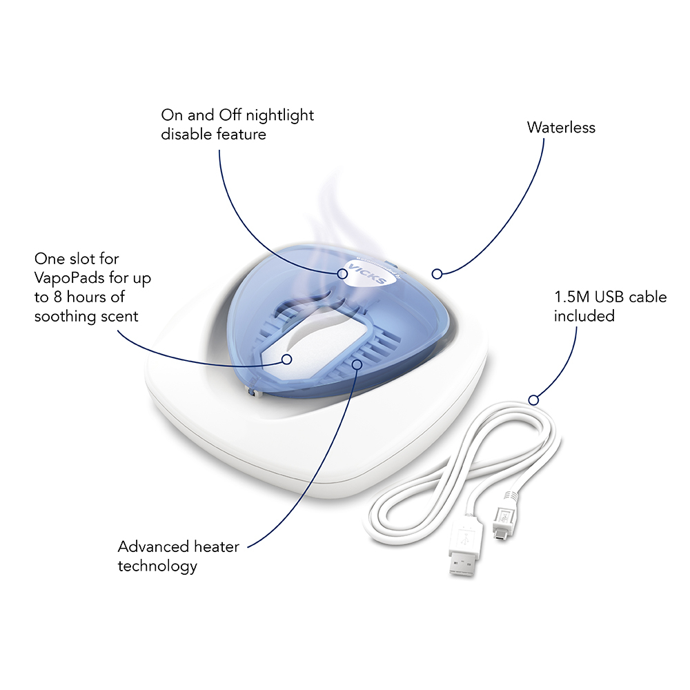 Urządzenie uwalnia kojące i aromatyczne opary ułatwiając oddychanie, które idealnie sprawdzi się do poprawy komfortu oddychania podczas nocy i przyniesie ulgę przy pierwszych objawach przeziębienia takich jak katar czy zatkany nos. Bezwodny dyfuzor delikatnie podgrzewa wkłady zapachowe VapoPad nasączone olejkami eterycznymi aktywując i uwalniając kojące opary w pomieszczeniu poprawiając komfort i jakość powietrze wdychanego, zapewniając uczucie łatwego oddychania. Zasilane przez USB urządzenie jest lekkie i idealnie sprawdzi się w podróży. Jego cicha funkcja z delikatnym nocnym podświetleniem zapewnia pełną funkcjonalność i dyskrecję zarówno w pracy, jak i podczas snu.