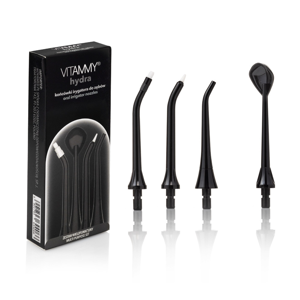 Podnieś standard codziennej higieny jamy ustnej dzięki wymiennym końcówkom do irygatora dentystycznego Vitammy Hydra. Nitkowanie za pomocą strumienia wody pod wysokim ciśnieniem zapewnia nieskazitelną czystość i znacząco zwiększa wygodę w porównaniu do klasycznego nitkowania.