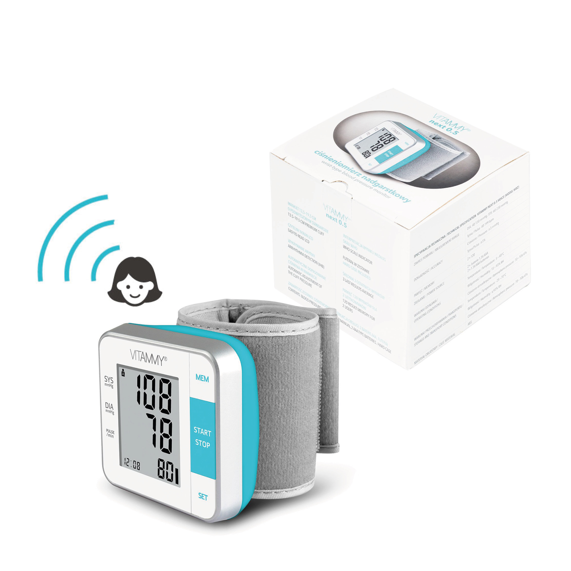 Vitammy Next 0.5 voice to ciśnieniomierz elektroniczny, który warto mieć zawsze przy sobie. Vitammy Next 0.5 voice ma szereg przydatnych funkcji ułatwiających dokładny pomiar ciśnienia w każdej sytuacji bez konieczności wizyty w gabinecie lekarskim. Potrzeba kontrolowania ciśnienia każdego dnia ułatwia dbanie o siebie w każdym wieku. Mierzenie ciśnienia jest jednym z elementów dbania o dietę, witalność i zdrowie. Pomiar ciśnienia jest dokonywany za pomocą metody oscylometrycznej, która polega na badaniu zmian ciśnienia wywołanych w pompowanym mankietem pomiarowym. Pomiar na nadgarstku będzie również bardziej wygodny i przystępny dla osób, które mogą mieć problem z zakłądaniem mankietu na ramię. Ciśnieniomierz wyróżnia się wykrywaniem arytmii i interpretacją wyników co jest ułatwieniem przy pomiarach u osób z schorzeniami. Pamięć i czytelny wyświetlacz sprawia że pomiar będzie codziennym nawykiem a nie obowiązkiem. Zestaw zawiera: ciśnieniomierz ze zintegrowanym mankietem, etui do przechowywania, 2 baterie AAA, instrukcję z gwarancją. To urządzenie zostało wyprodukowane zgodnie z europejskimi normami: EN1060-1; EN1060-3; IEC 80601-2-30; ISO81060-1; IEC60601-1-11; IEC60601 1; Kompatybilność elektromagnetyczna: Urządzenie spełnia wymagania normy międzynarodowej IEC60601-1-2.