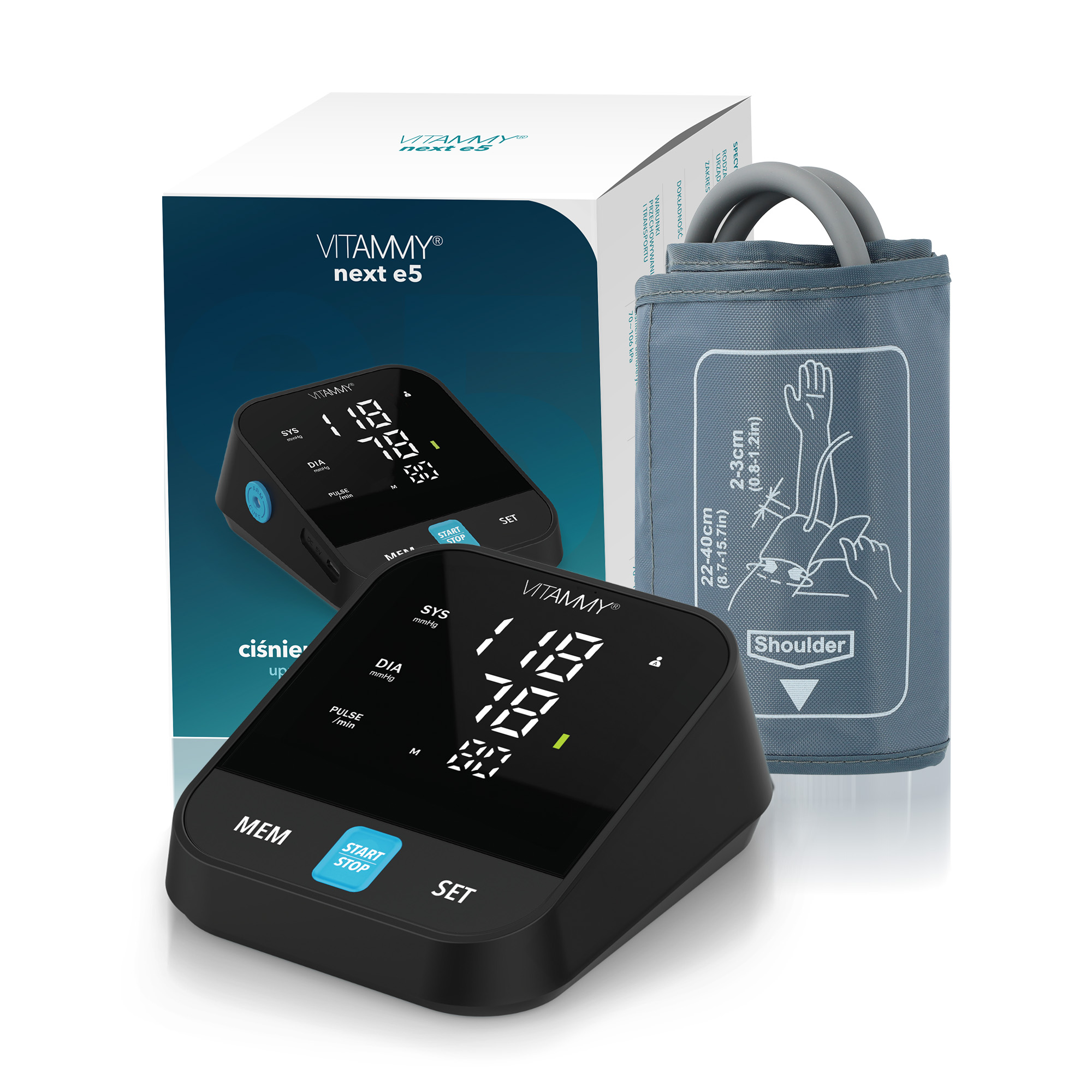 Ciśnieniomierz VITAMMY Next e5 to nowoczesne, łatwe w obsłudze, w pełni automatyczne, urządzenie medyczne. Klasyczny kształt