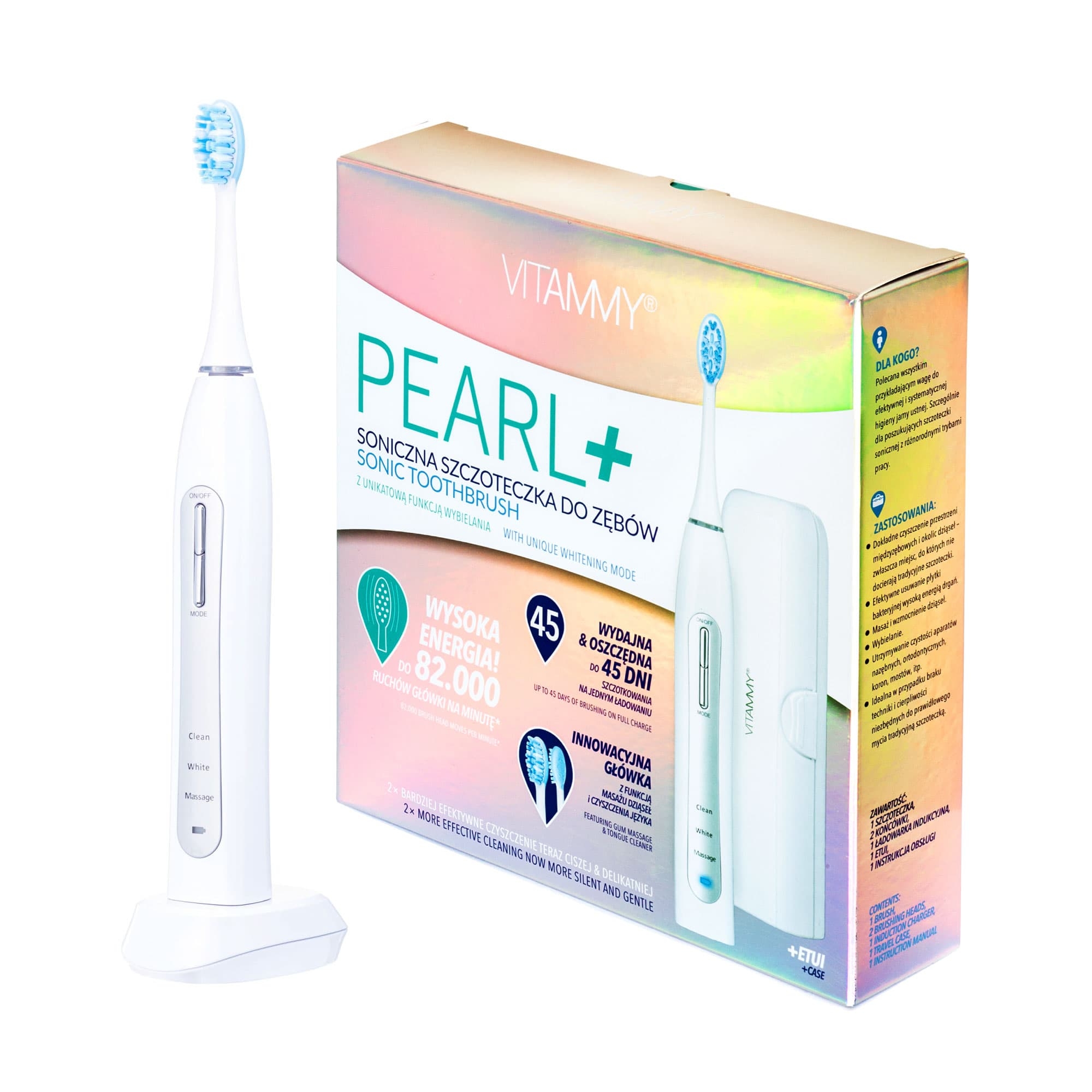 Szczoteczka soniczna VITAMMY Pearl+ to połączenie nowoczesnej technologii i eleganckiego designu. Dzięki 82 000 ruchów na minutę zapewnia skuteczne czyszczenie, które przewyższa tradycyjne szczoteczki manualne.