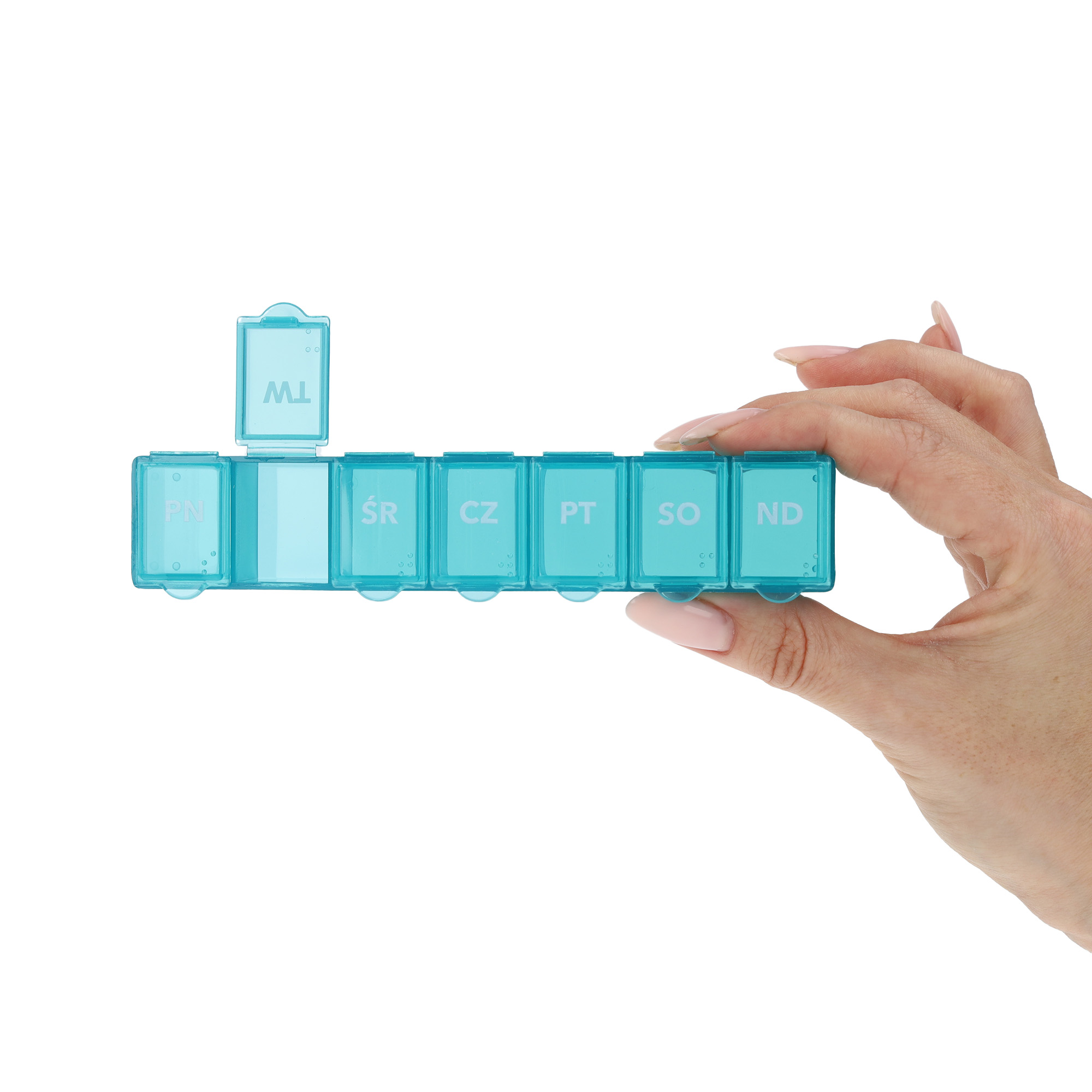 Kasetka podzielona jest na 7 przegródek – po jednej na każdy dzień tygodnia. Każda komora jest wyraźnie oznaczona pierwszymi literami dnia tygodnia, zarówno w druku, jak i w alfabecie Braille’a – co ułatwia korzystanie osobom z dysfunkcją wzroku. Pojemniki otwierają się lekko i zamykają szczelnie, zapewniając bezpieczeństwo przechowywania tabletek.