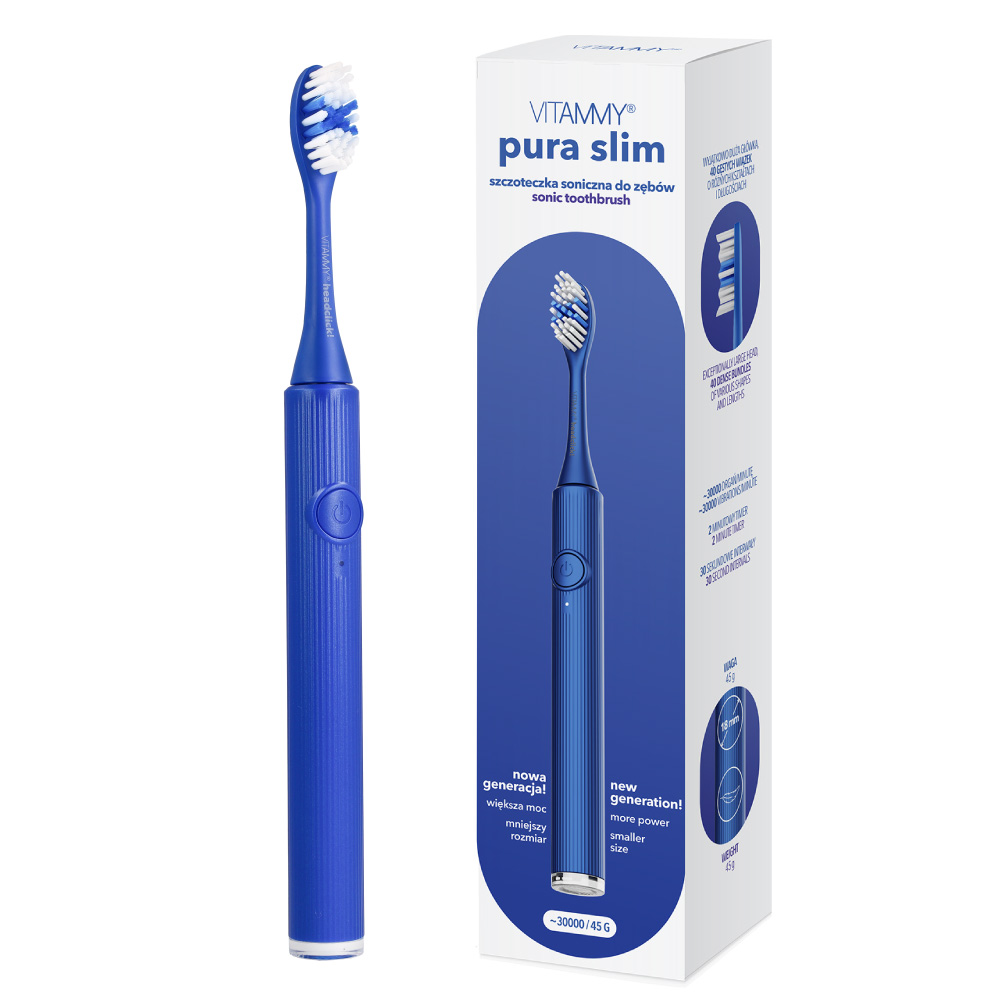 Pura Slim to szczoteczka soniczna proponująca minimalistyczny design w czterech wyrazistych kolorach, uszlachetnionych opalizującym lakierem. Łączy w sobie lekkość manualnej szczoteczki z wydajnością szczoteczki sonicznej. Dzięki ultralekkiej wadze oraz energooszczędnej technologii, oferuje wyjątkową wygodę użytkowania w wersji EKO. Wyposażona jest w specjalny system headclick zapobiegający zanieczyszczeniom. Dwa uniwersalne programy i timer w połączeniu ze specjalnie wyprofilowaną dużą główką wyposażoną w 40 wiązek włókien, pozwolą dobrze umyć zęby. Wytrzymała bateria, zapewnia nawet ponad 45 dni działania po pełnym naładowaniu. Wodoodporność IPX7 zapewnia komfortowe użytkowanie w każdej łazience.