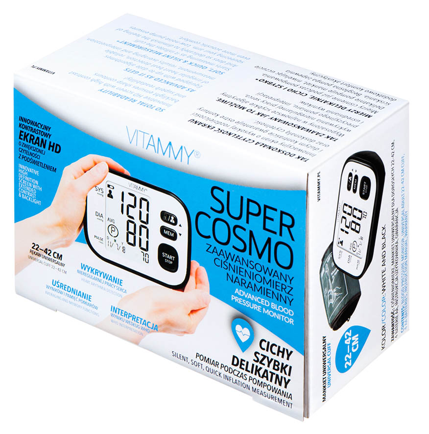 ciśnieniomierz, mankiet uniwersalny dla dorosłych 22-42 cm, 4 baterie AA, instrukcja użytkownika, gwarancja.