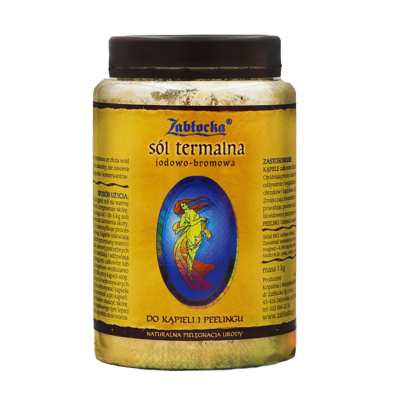 Zabłocka sól termalna jodowo-bromowa do kąpieli, peelingu, inhalacji, okladów i płukania gardła.Jest to sól o najwyższym w świecie stężeniu jodu. Ponadto w swoim składzie zawiera bardzo duże stężenie jonów: bromu, wapnia, magnezu, krzemu, selenu oraz niemal wszystkie pierwiastki śladowe. Tradycyjne- panwiowe metody produkcji, przez lata udoskonalane, pozwalają otrzymywać produkt o wyjątkowo bogatym i unikatowym na skalę światową składzie chemicznym. Sól ta od wielu lat wykorzystywana jest w wodolecznictwie, balneologii i hydroterapii, do kąpieli solankowych wykonywanych w sanatoriach, uzdrowiskach i ośrodkach rehabilitacyjnych. Sposób użycia:Kąpiele wspomagające oraz profilaktyczneWykonywane są w sanatoriach, szpitalach i ośrodkach rehabilitacyjnych. W warunkach domowych można wykonywać kąpiele wspomagające, oraz profilaktyczne. Już dodanie 1 szklanki zabłockiej soli termalnej do każdej kąpieli przyniesie znaczne efekty, a klimat w łazience upodobni się do nadmorskiego. Kąpiele najczęściej wykonuje się w roztworze o stężeniu od 1% do 5 %. Przy wyższym stężeniu należy je wykonywać pod kontrolą lekarza. Kąpiele oczyszczajace i detoksykacyjne wykonywane są w stężeniu pow.6 % Roztwór 1% otrzymamy wsypując do wanny na 100 litrów wody 1 kg soli. Roztwór 3% odpowiednio 3 kg soli na 100 l wody. Kąpiele wykonuje się w temp. 36 – 38 st.C w seriach po 10, wykonywanych co drugi dzień 2 razy do roku, lub jednorazowo w okresie nasilenia objawów.Kąpiele kosmetyczneCelem takiej kąpieli jest odżywienie, nawilżenie i oczyszczenie skóry. Kąpiel taka przyczyni się do opóźnienia procesów starzenia skóry, wygładzenia zmarszczek, likwidacji rozstępów, wyprysków, czyraków i cellulitu. Wykonywane są w salonach kosmetycznych, farmach piękności, ośrodkach wellness i SPA a także w warunkach domowych. Kąpiele wykonywane są najczęściej w roztworach o stężeniu soli od 0,2 do 1,5 % w zależności od potrzeby zastosowania, rodzaju skóry: czy jest sucha czy tłusta, oraz od właściwości osobniczych. Czas trwania kąpieli wynosi od 10 do 30 minut, a temperatura roztworu 37 do 39 st.C.Rodzajem częściowej kąpieli kosmetycznej jest moczenie rąk i nóg w trakcie manikiru i pedikiru. Solanka wówczas nie tylko idealnie zmiękczy skórę, ale także odżywi i wzmocni paznokcie, a minerały termalne przyniosą także efekty grzybobójcze, antybakteryjne i przeciwzapalne. Zabiegi odchudzające wykonywane są zawsze w roztworach solnych o stężeniu powyżej 1 %. Kąpiele likwidujące przykry zapach potu zalecane są w stężeniach min. 3 %. Kąpiele dla skóry trądzikowej, pokrytej ranami, czyrakami, wypryskami, z ropiejącymi i nie gojącymi się ranami, a także przy łuszczycy możemy wykonywać w stężeniu nawet do 6 %HydromasażeZabłockie sole i solanki można stosować w wannach z hydromasażem (gdy nie zabrania tego producent wanny). Znacznie podniosą one walory i atrakcje kąpieli, a ich działanie bodźcowe będzie znacznie silniejsze. Sole i solanki Zabłocka nie posiadają zanieczyszczeń, nie będą się więc wytrącały osady mogące uszkodzić wanny.Kąpiele całkowitePodczas takiej kąpieli zanurzone zostają w wannie znaczne partie ciała. Większa jest zatem powierzchnia i moc oddziaływania bodźców kąpielowych na nasz organizm.Kąpiele częścioweStosujemy w sytuacji gdy chcemy poddać działaniu tylko wybrane miejsca np. pocące się dłonie czy stopy, albo marznące nogi, czy też swędzące ręce. Gdy w domu nie ma wanny znakomite efekty kąpielowe możemy uzyskać mocząc tylko nogi. W miednicy lub przystosowanych do tego masażerach stóp. W takiej sytuacji łatwiej jest uzyskać większe stężenie roztworu kąpielowego, a nadto można znacznie podnieść jego temperaturę. Już nasze babcie w profilaktyce przeziębień i grypy stosowały moczenia stóp w gorącym roztworze soli i bezpośrednio przed udaniem się do łóżka.Przykład stężeń: Rozpuszczając 1 kg soli w 30 litrach wody otrzymamy roztwór o stężeniu ok. 3 %, a w 100 litrach ok. 1 %. Produkt w 100 % naturalny. Nie zawiera barwników, środków zapachowych, konserwantów.Produkt testowany dermatologicznie.