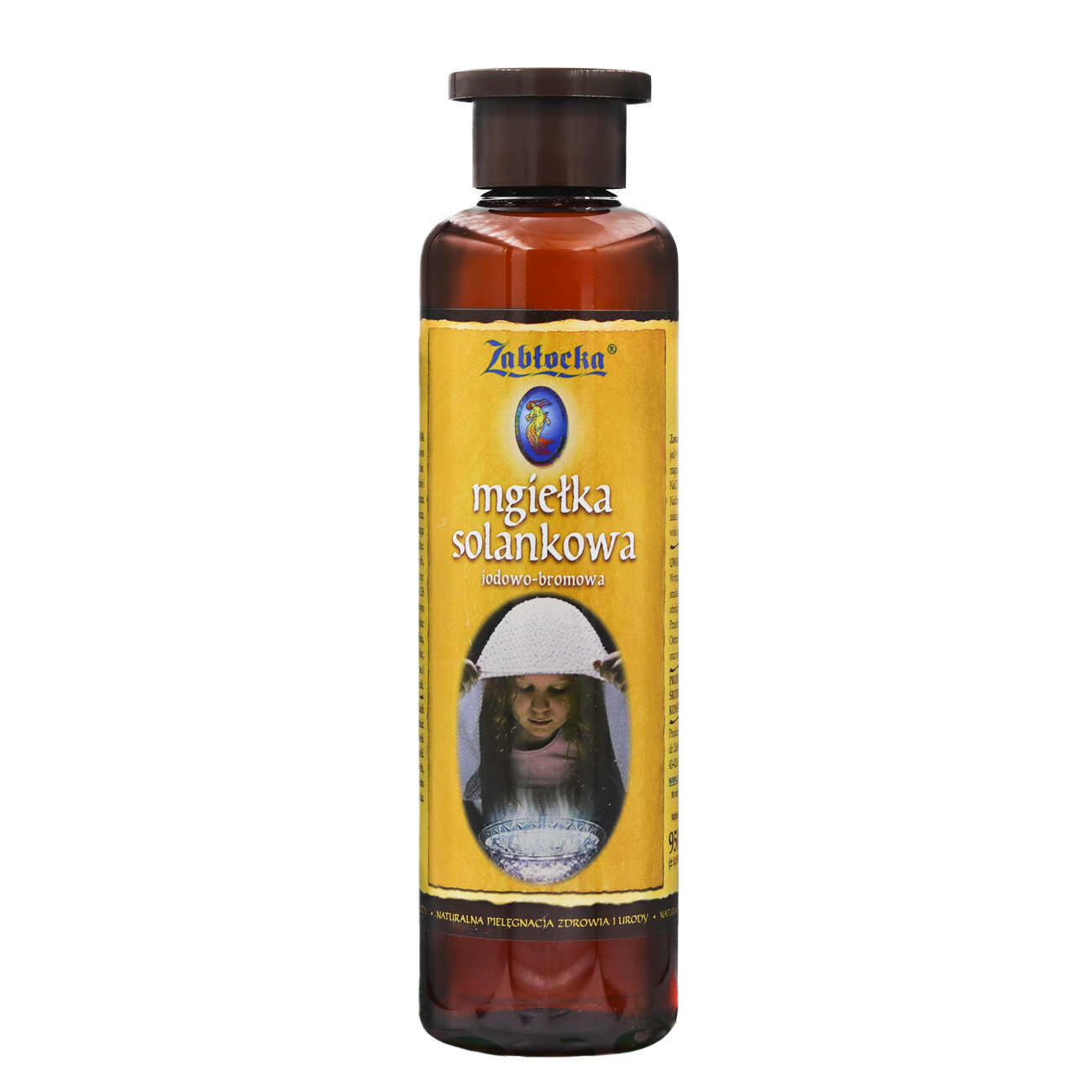 Zabłocka mgiełka solankowa jodowo-bromowa do inhalacji 950mlSolanka jodowo-bromowa w płynie do inhalacji, nawilżaczy i płukania gardłaZabłocka Mgiełka solankowa jodowo – bromowa jest to substancja, która posiada wysokie stężenie jodu i innych mikro i makro pierwiastków.W 1 litrze solanki znajduje się ponad: 110 mg jodu, 130 mg bromu, 800 mg wapnia, 400 mg magnezu. Solanka ta czysta biologicznie, gdyż przez miliony lat nie miała kontaktu ze światem zewnętrznym. Złoże solankowe znajduje się w Dębowcu na głębokości ponad 500 m pod powierzchnią ziemiAnaliza fizyko-chemiczna solanki z odwiertu St-5 przeprowadzona w dniu 29.10.2014 przez Laboratotium Analiz Wód Głównego Instytutu GórnictwaWygląd zewnętrzny: woda przeźroczysta, bezbarwnaZapach: swoistySmak: słonyOdczyn pH: 7,4Przewodność: 53400 Ms/cmAnionyjodki 120 mg/kgbromki 160 mg/kgkrzemiany11,6 mg/kgwodorowęglany 61 mg/kgchlorki 23000 mg/kgsiarczany 2,7 mg/kgKationywapń 1170 mg/kgmagnez 516 mg/kgpotas 86,5 mg/kgżelazo 0,44 mg/kgsód 13100mg/kgstront 44,8 mg/kgZABŁOCKA MGIEŁKA SOLANKOWA JODOWO-BROMOWA przeznaczona jest dla dzieci i dorosłych.Skuteczność Zabłockiej mgiełki solankowej wynika z jej naturalnej kompozycji mineralnej, a zwłaszcza z bardzo wysokiego stężenia jodu, oraz takich pierwiastków jak: brom, wapń i magnez. SPOSÓB UŻYCIA – INHALACJEW warunkach domowych do zabiegu stosujemy najczęściej roztwory fizjologiczne o stężeniu ok. 1%.Otrzymamy go rozcieńczając Zabłocką Mgiełkę Solankowa z wodą w proporcji 1 do 2.Silniej działa Zabłocka Mgiełka Solankowa stosowana bez rozcieńczania.Inhalację przeprowadzamy w urządzeniach do tego przeznaczonych tzn inhalatorach i nebulizatorach lub wdychając opary zagotowanej Zabłockiej Mgiełki solankowej.SPOSÓB UŻYCIA – PŁUKANIE UST I GARDŁAPłukanki robimy kilkakrotnie w ciągu dnia, po każdym posiłku oraz po umyciu zębów.SPOSÓB UŻYCIA – NAWILŻANIE I ROZPYLANIEW celu właściwego nawilżenia i zjonizowania pomieszczeń w sezonie grzewczym i w budynkach klimatyzowanych, można stosować Zabłocką mgiełkę solankową jodowo-bromową.Stosujemy ją w urządzeniach do nawilżania, w fontannach, mini tężniach i generatorach aerozoli.WYJĄTKOWOŚĆSkład chemiczny solanki charakteryzuje się wyjątkowo wysoką mineralizacją właściwą dla produktów pochodzących z morza. Stężenie jonów jodu jest najwyższe z dotychczas odkrytych na świecie źródeł solankowych. Nadto w wyjątkowo wysokim stężeniu występują jony: wapnia, magnezu, bromu, boru, krzemu, selenu i wielu innych biopierwiastków.Szczególnie cenną właściwością Mgiełki jest to, że pierwiastki te znajdują się w stanie równowagi chemicznej.Wdychając Zabłocką mgiełkę solankową jodowo-bromową można w warunkach domowych zrekonstruować nadmorski mikroklimat.